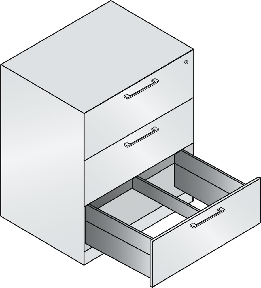 · Langlebige, körperschallgedämpfte Stahlkonstruktion mit hochwertiger Einbrennlackierung ∙ Schubladen auf 100 % ausziehbaren Kugelrollen-Teleskopführungen ∙ Schubladenfronten mit matt-verchromtem Bügelgriff ∙ Zentralverschluss mit Auszugsperre ∙ Austauschbarer Wechselkern, inkl. 2 Schlüsseln ∙ Inkl. selbstklebenden Kunststoff-Etikettenrahmen