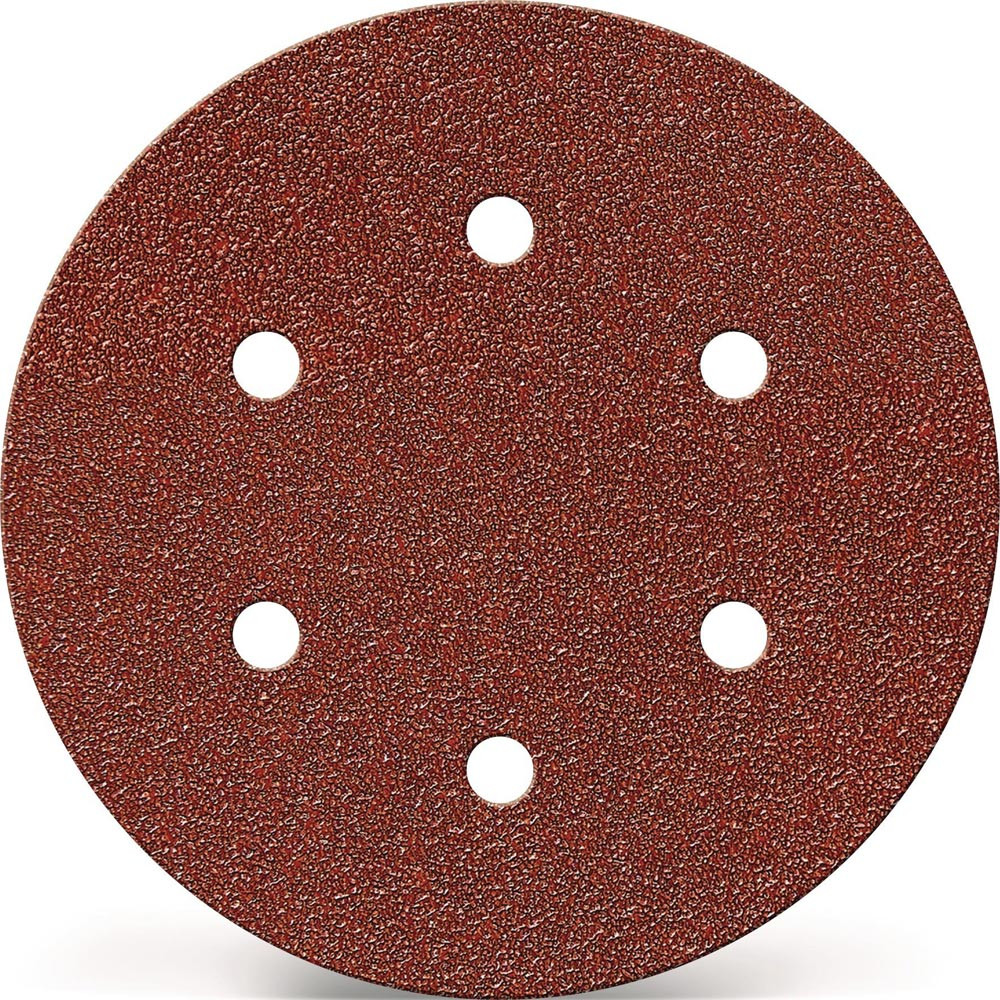 Korund · universell für alle Schleifvorgänge geeignet · Entfernen von Rost und Farbe · Schleifen von Holz und Metallen · passend zu allen Exzenterschleifern mit 6- oder 8-fach gelochter Aufnahmeplatte · Absauglöcher Ø 10 mm · kletthaftend · Für Elektrowerkzeuge der Fabrikate Bosch, DeWalt, ELU, Hitachi und Metabo
