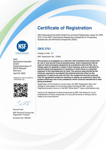 weißliches Schmieröl mit PTFE · lange Betriebszeiten durch hohe Temperatur- und Oxidationsstabilität · hohes Druckaufnahmevermögen · sehr guter Verschleißschutz, gut haftend · beständig gegen Wasserdampf, alkalische und saure Desinfektions- und Reinigungsmittel · geschmacks- und geruchsneutral · MOSH/MOAH-frei · NSF H1 Reg.-Nr. 124801