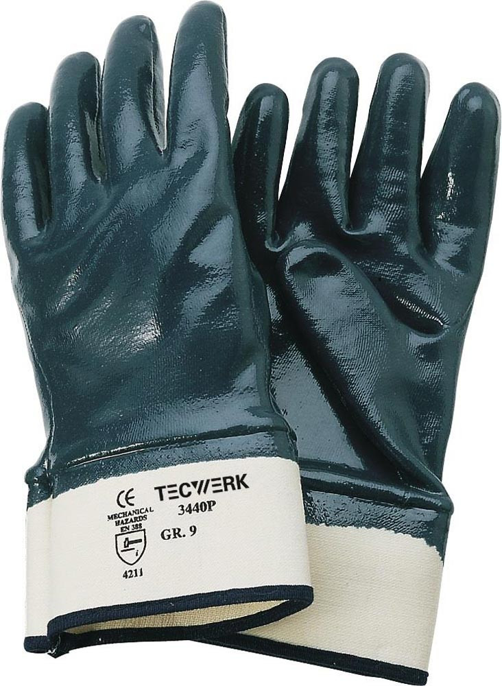 nach EN 388 · EN 420 · Kat. II · Material: widerstandsfähige, hochwertige Nitrilbeschichtung · robust beim Umgang mit scharfkantigen Materialien · flüssigkeitsabweisend · stößt Fett und Öl wirksam ab · mit Sicherheitsstulpe · hohe Abriebfestigkeit · gummierte Stulpe · Trägermaterial 100% Baumwolle · Anwendung: