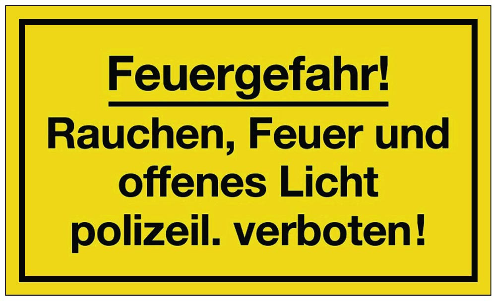 Feuergefahr! Rauchen, Feuer und offenes Licht polizeil. verboten!