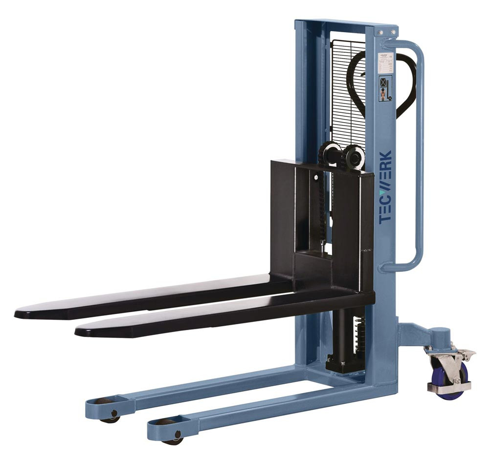 Tragfähigkeit 1000 kg · Stapler für leichte, gelegentliche Einsatzbedingungen im innerbetrieblichen Bereich · robustes Fahrgestell, geschweißte Mastkonstruktion aus Präzisionsprofilen · manuelles Heben und Verfahren · Schnellhub bis ca. 150 kg · dosierbare Senkgeschwindigkeit für feinfühliges Absenken der Last · robustes Hydrauliksystem mit Überlastsicherung · Feststellbremse · Oberflächenschutz durch hochwertige Mehrfachlackierung in taubenblau, RAL 5014
