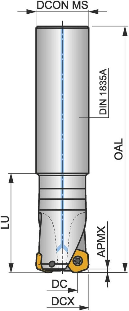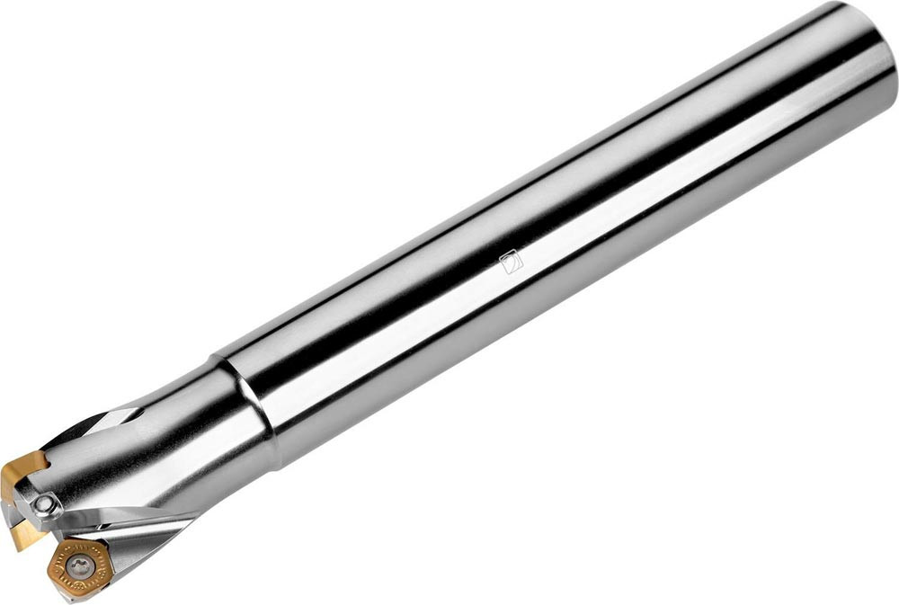 Hochvorschubfräser mit positiver/negativer Geometrie zum spannen von 3 Stück PD.X 0905ZE.. · PDKT 0905.. oder PDMW 0905.. einseitigen Wendeschneidplatten · Schnittdurchmesser 40mm mit 19° Anstellwinkel und 32mm Zylinderschaft gemäß DIN 1835A · 60mm Funktionslänge 250mm Gesamtlänge · Kühlkanalbohrung zum Planfräsen mit einer maximalen Schnitttiefe von 2.0mm