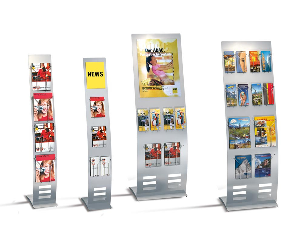 · Ob als Wegweiser oder Plakathalter, für schnelle Firmeninfos oder einfach für Willkommensgrüße · Pulverbeschichteter Infoständer aus stabilem Stahl · RAL 9006 alusilber · Mit schwerem Standfuß · Vorbereitet mit Systemlochungen zur wahlweisen oder kombinierten Aufnahme von Wechselrahmen für Selbstbeschriftungen oder Vorratshaltern aus Stahldraht für Formate DIN A4, DIN A5 oder DIN lang · Am schmalen Infoständer kann die DIN A4 Plakattasche (Hochformat) eingesetzt werden · Am breiten Infoständer können auch DIN A2 Plakattaschen befestigt werden · Die Plakattaschen werden durch rückseitig verlaufenden Magnetstreifen gehalten, somit lassen sich Schriftstücke und Plakate in Sekundenschnelle wechseln