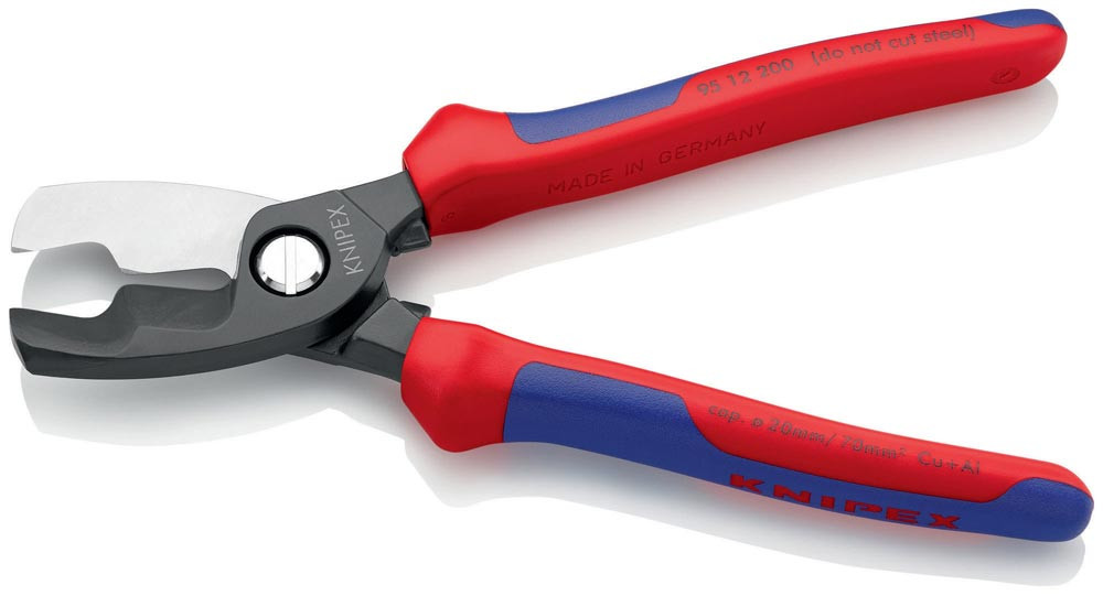 mit Doppelschneide · für Kupfer-/Alukabel, ein- und mehrdrähtig · gehärtete Schneiden mit Präzisionsschliff · mit Vor- und Nachschnitt (1. und 2. Schneide) können Kabel bis 20 mm Ø in Einhandbetätigung getrennt werden · nicht für Stahldraht und hartgezogene Kupferleiter geeignet · Klemmschutz · Spezial-Werkzeugstahl in Sondergüte, geschmiedet, ölgehärtet