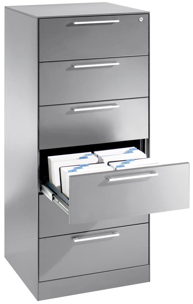 Karteischrank, BxTxH 562x600x1298 mm, DIN A5, zweibahnig, 6 Schubladen, Bügelgriff, RAL 7035 lichtgrau