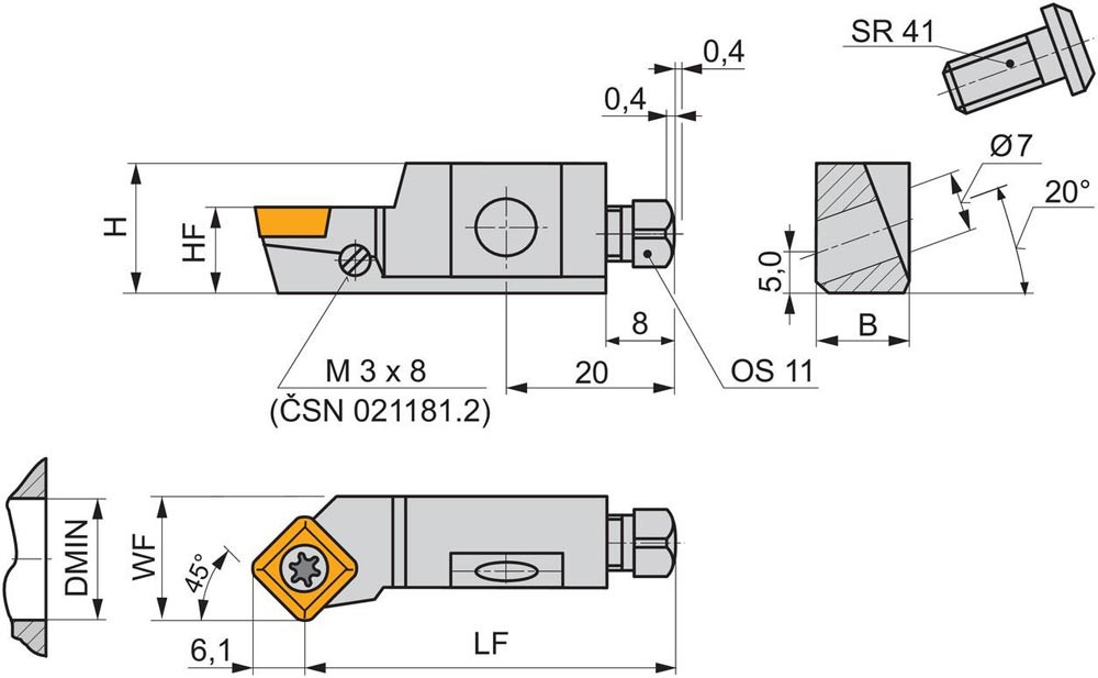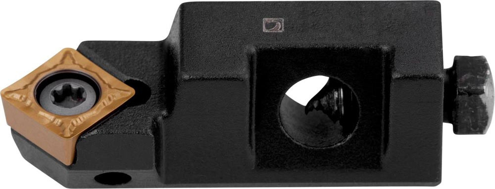 ISO-Dreheinsatz mit Schraubenklemmung zum spannen von Viereckig positive Wendeschneidplatten mit einem Innenkreisdurchmesser von 9.525mm · 3.97mm Dick (ISO Bezeichnung SC.. 09T3.. ) · nach DIN 4985 rechte Ausführung zum 45° Stirndrehen mit abgesetzem Schaft für entgraten sowie Innenentgraten