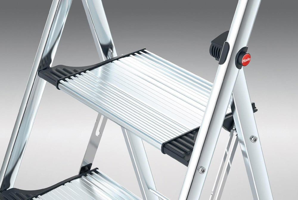 stabile Aluminiumholme · mit hochgeschwungenem Aluminium-Sicherheitsbügel · praktische Ablageschale für Kleinteile · treppenförmige Stufenanordnung · extra große, rutschfest geriffelte Aluminium-Stufen B 300 x T 225 mm · Leiterschuhe mit Soft-Grip Sohle für optimalen Stand auf verschiedenen Böden · max. Gesamtbelastung 150 kg