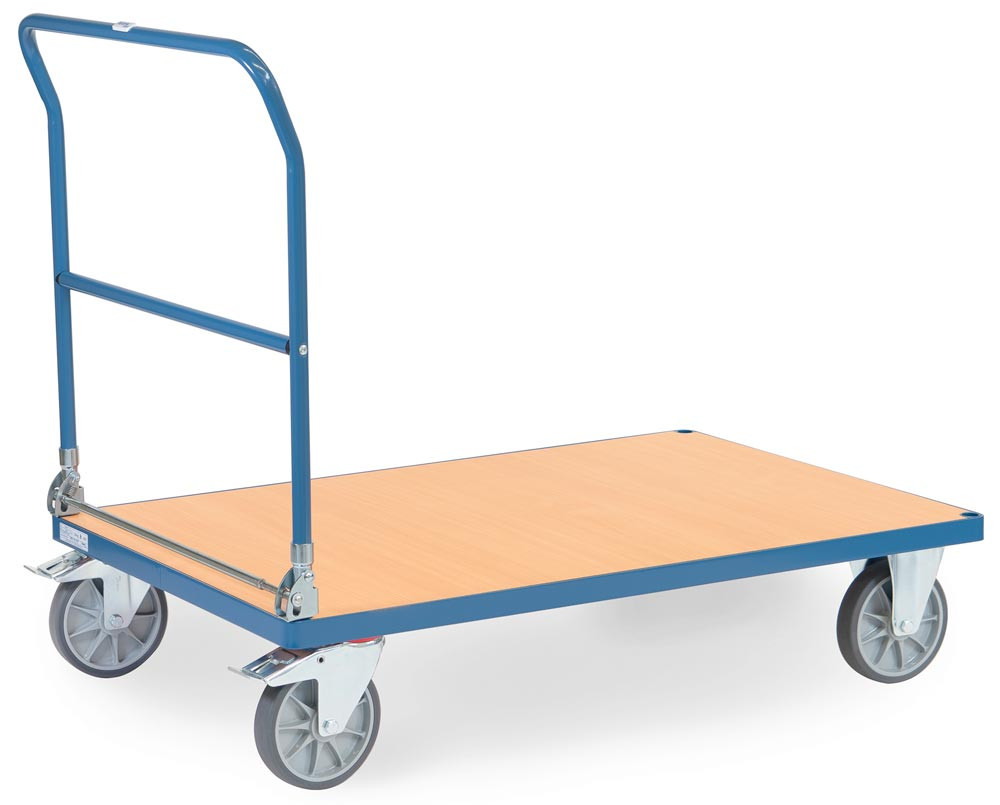 · Schweißkonstruktion aus Stahlrohr · Schlag- und kratzfest · Ladefläche Holzwerkstoffplatte mit Buchendekor · Schiebebügel klappbar · 2 Lenk- und 2 Bockrollen · Lenkrollen gemäß EN 1757-3 mit Rad-Feststeller · TPE-Bereifung (thermoplastisches Elastomer) · Naben mit Rillenkugellager