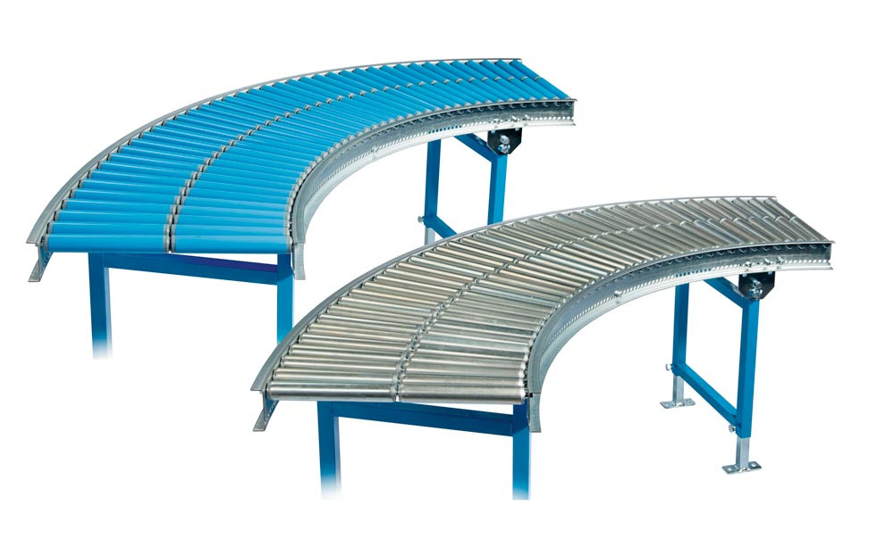 innenradius 800 mm ∙ Tragrollen der Kurven je nach Bahnbreite durchgehend bzw. mehrfach geteilt ∙ Die Tragrollen stehen über die Rahmenoberkante hinaus,