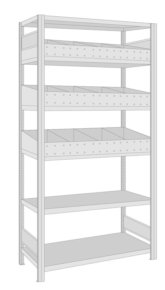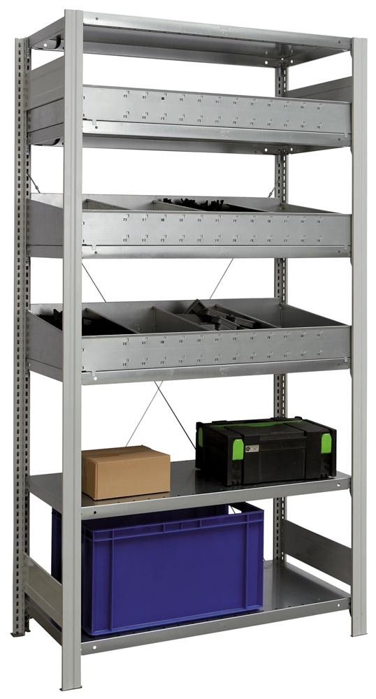 Kleinteile-Regalmodul 2, Grundfeld, BxTxH 1005x500x2000 mm, 3 Böden verzinkt, 3xSchüttenset mit Stahlfachboden und 15 Abtrenner EP532751
