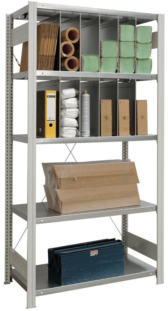 Kleinteile-Regalmodul 4, Grundfeld, BxTxH 1005x500x2000 mm, 5 Böden verzinkt, 10xStecktrennwand, Höhe 410 mm