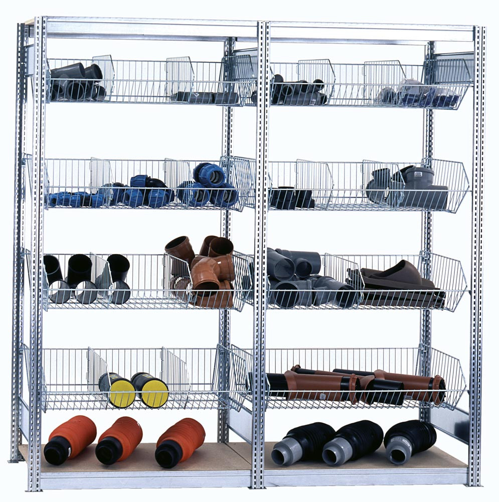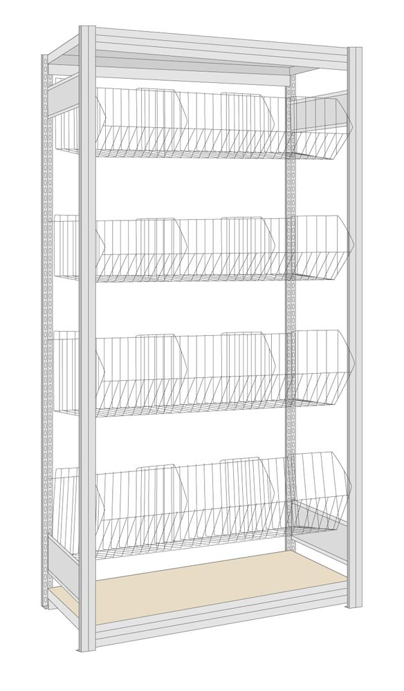 · Das Regal ist ausgestattet mit 4 Fachebenen mit Gitterkörben, 2 Fachebenen mit Spanplatten (Stufenbalken und Einlegeboden Spanplatte 16 mm, P4) und 8 Trenngittern für die Gitterkörbe