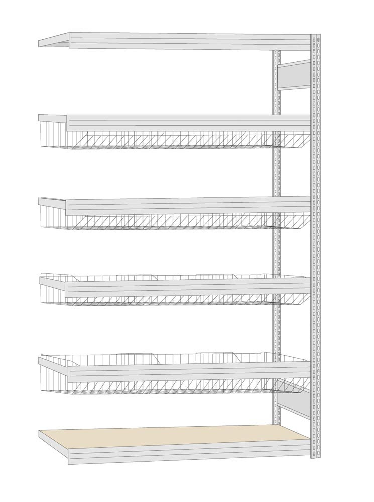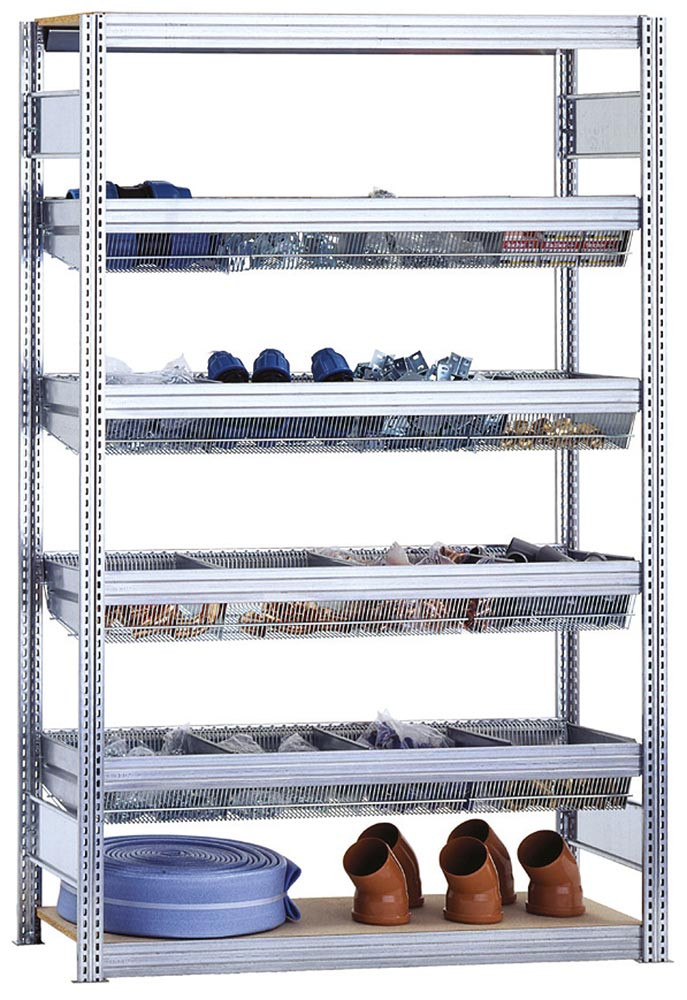 · Das Regal ist ausgestattet mit 4 Fachebenen mit Gitterwannen auf Stufenbalken, 2 Fachebenen mit Spanplatten (Stufenbalken und Einlegeboden Spanplatte 16 mm, P4) und 20 Fachteilern für die Gitterwannen ∙ Die Gitterwannen sind aus verzinktem Draht, maßgenau auf Regalbreite zugeschnitten, einfach einzuhängen in den Stufenbalken ∙ Fachlast Gitterwanne 150 kg ∙ Fachteiler aus Kunststoff für die Gitterwanne individuell steckbar