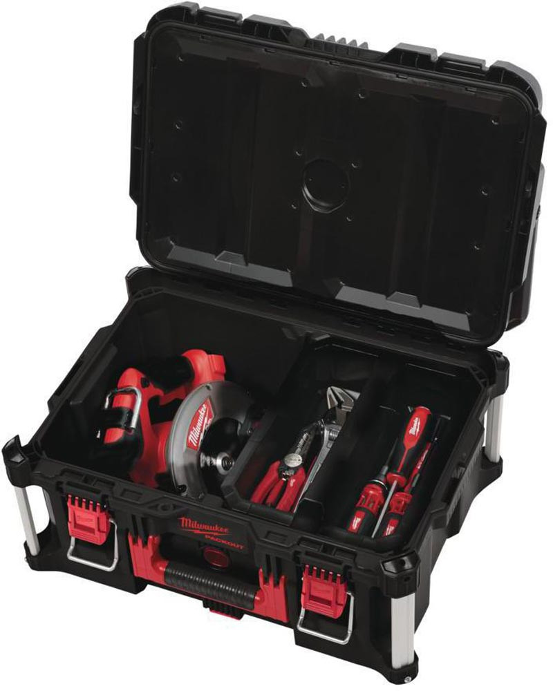 aus dem modularen Aufbewahrungssystem PACKOUT™ · Konstruktion mit stoßfesten Polymeren - ideal für den Baustelleneinsatz · IP65 Schutzklasse schützt vor Staub · Wasser und Schmutz · Metallstreben verstärken die Kofferecken · Verschlüsse mit Metallschließen · inklusive zusätzlicher Boxen zum übersichtlichen Verstauen von Kleinteilen · Einbaumöglichkeit für den ONE KEY™ TICK™ · zusätzlicher Metalltragegriff im Kofferdeckel zum leichteren Transport (nur beim großen Koffer)