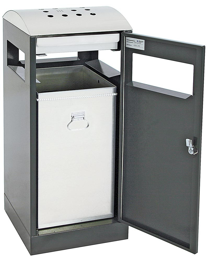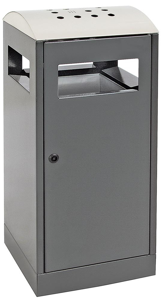 ∙ Korpus aus verzinktem Stahlblech, pulverbeschichtet RAL 7016 anthrazitgrau ∙ Mit verzinktem Innenbehälter ∙ Einwurföffnung an allen vier Seiten ∙ Niveauregulierung durch Stellfüße im Frontbereich ∙ Integrierte Ascherlade im oberen Bereich ∙ Gelochtes Kopfteil aus Edelstahl ∙ Flügeltüre per Vierkant verriegelbar ∙ Inklusive Montageprofil zu Bodenbefestigung
