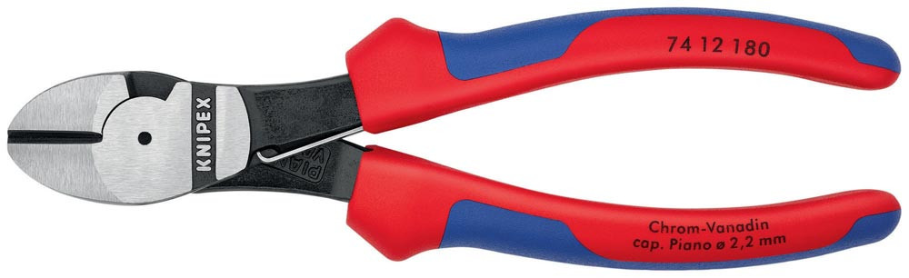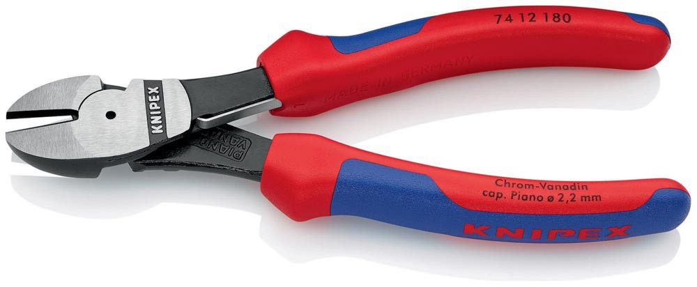 20 % Kraftersparnis gegenüber herkömmlichen Seitenschneider · mit Öffnungsfeder · Schneiden zusätzlich induktiv gehärtet, Schneidenhärte ca. 64 HRC · Chrom-Vanadin-Hochleistungsstahl, geschmiedet, mehrstufig ölgehärtet