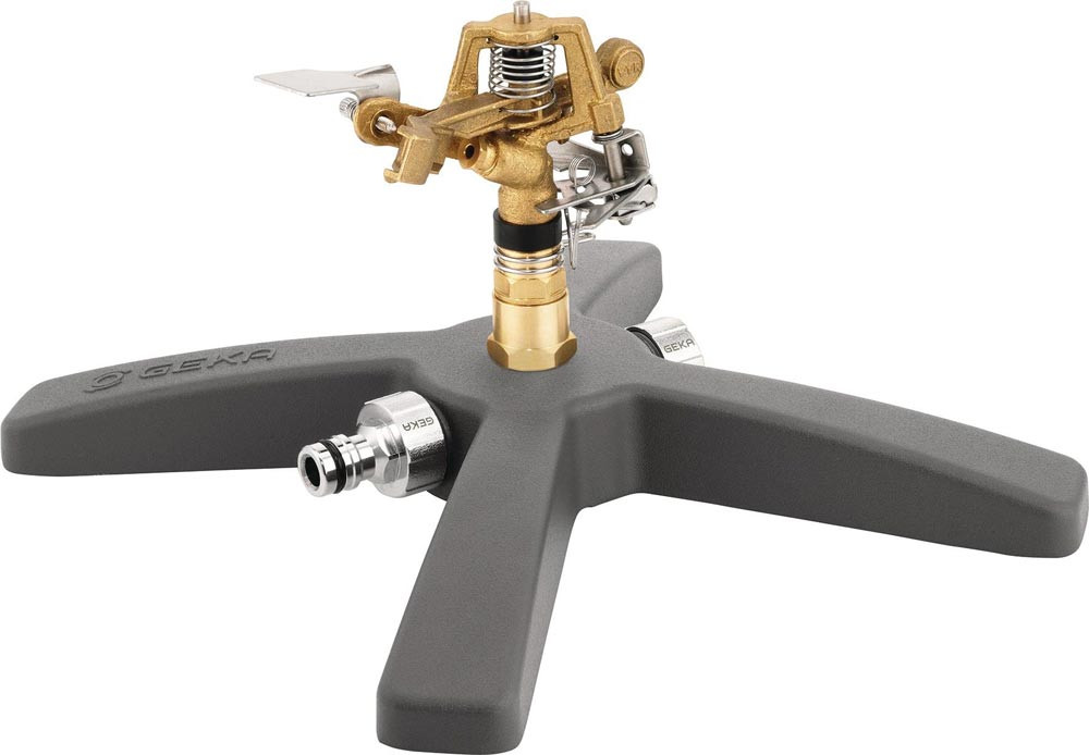 robuster aus Metall gefertigter Schwinghebelregner in Profiqualität · ermöglicht die Bewässerung von Kreisflächen bis maximal 26 m Durchmesser oder individuell einstellbaren Kreissegmenten · mit verchromten Messingstecker · kompatibel mit allen marktüblichen Stecksystemen · der neue robuste Standfuß aus pulverbeschichtetem Aluminium hat eine matte, strukturierte Oberfläche · er bietet durch seine Sternform einen stabilen Stand und maximale Flexibilität, da jetzt auch die Nutzung mit Klauenkupplungen beidseitig möglich ist
