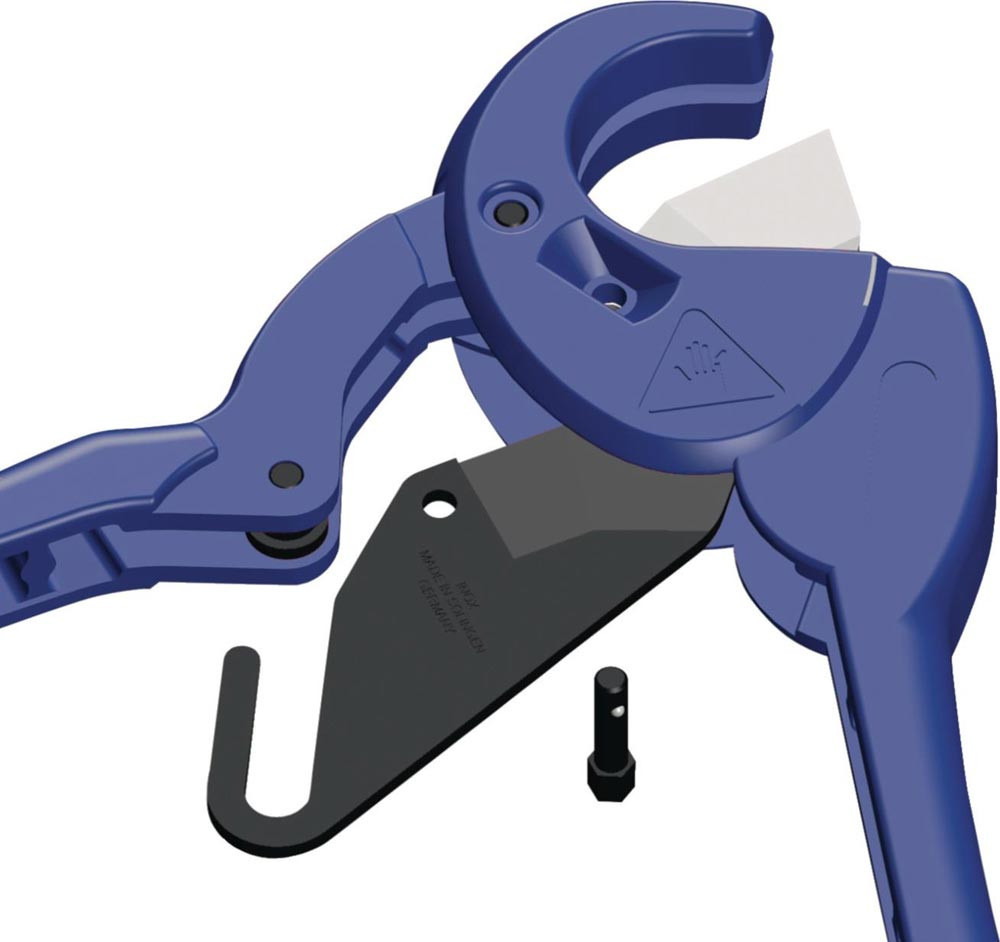zum Schneiden von PE, PP, PB, PEX, PPR, MLP/MSR, VPE, CPVC, PVC, PVDF · leichter, schneller und präziser Schnitt mit minimaler Anwendungskraft durch verbesserte Kraftübertragung · sofortiger Klingenwechsel ohne Werkzeug · aus Magnesium-Druckguss, sehr leicht und robust · Inox-Klinge (Made in Solingen/Germany) von höchster Qualität und Lebensdauer mit optimaler Schneidgeometrie und antihaftbeschichteter Oberfläche · Klinge geschützt im Körper - vermeidet Beschädigungen der Schneide und Verletzungen des Anwenders