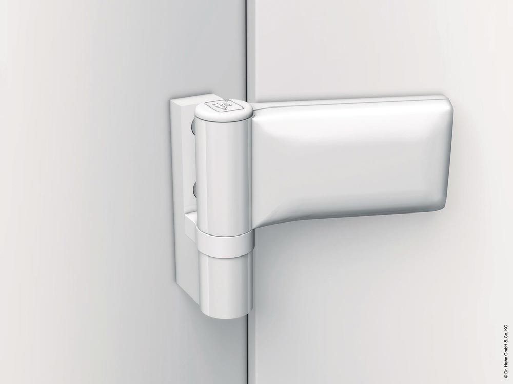 Direktbefestigung · Aufschraubband für Haupt- und Nebeneingangstüren · DIN links / rechts verwendbar · dreidimensional verstellbar · gefertigt aus stranggepresstem Aluminium · Kunststoffteile weiß · Lagerstelle wartungsfrei