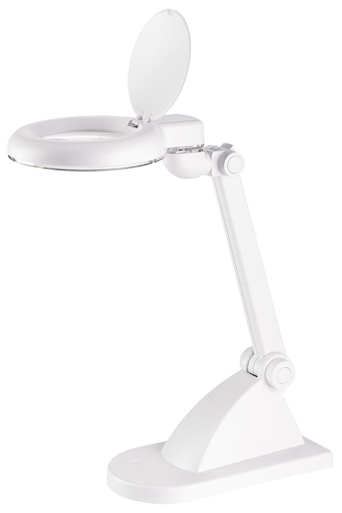 Kunststoff ∙ mit Standfuß ∙ runder Kopf ∙ Glaslinse 88,9 mm (3,5”) 3 Dioptrien, mit eingelassenem Auge 12 Dioptrien, mit Abdeckung ∙ Betriebsspannung 230 V · Lichtfarbe 6.400 Kelvin - tageslichtweiß ∙ Lichtstrom 396-468 Lumen ∙ Lebensdauer 30.000 Stunden ∙ Effizienzklasse E (Spektrum A bis G) ∙ diese Leuchte enthält eingebaute LED-Lampen ∙ die Lampen können nicht ausgetauscht werden
