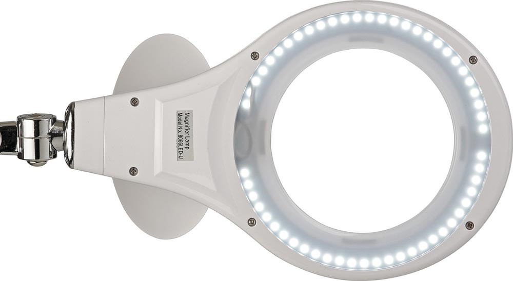 Metall ∙ mit Tischklemme ∙ Parallelogramm-Metallarm 80° drehbar, 110° neigbar ∙ Armlänge unten 400 mm - oben 440 mm - Höhe 500 mm ∙ 3 Dioptrien-Linse (1,75-fache Vergrößerung), Ø 5″ (127 mm), Linsenfläche 144 cm² ∙ Betriebsspannung 220-240 V ∙ Lichtfarbe 6.500 Kelvin - tageslichtweiß ∙ Lichtstrom 922 Lumen ∙ Lebensdauer 50.000 Stunden ∙ Effizienzklasse E (Spektrum A bis G) ∙ gewichteter Energieverbrauch 8 kWh/1000 h