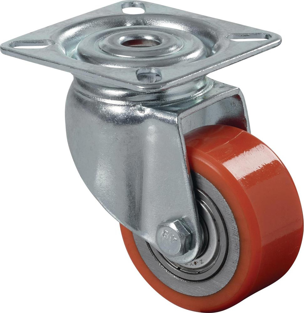 Gabel aus Stahlblech, zweireihiger Kugelkranz im Gabelkopf, Lauffläche Polyurethan 90+/-3 Shore A, niedrige Bauhöhe, hohe Tragkraft, Kugellager · verzinkt · mit Plattenbefestigung · sehr hoher Rollwiderstand und sehr hohe Verschleißbeständigkeit