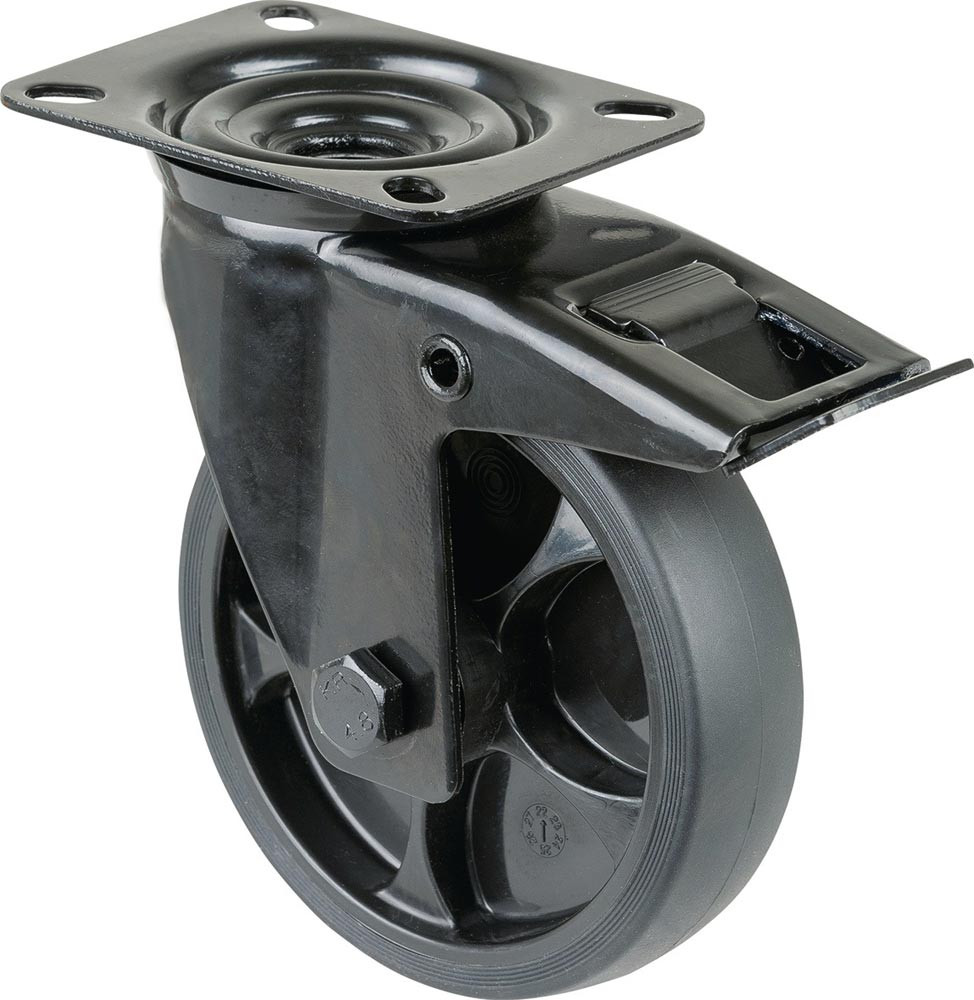 Transportgeräterolle mit Totalfeststeller · thermoplastisches Gummirad schwarz · Radkörper Kunststoff schwarz · Rollenlager · mit Plattenbefestigung