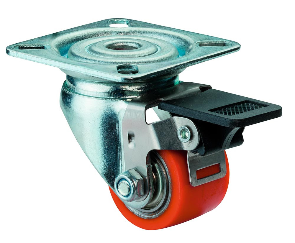 Gabel aus Stahlblech · zweireihiger Kugelkranz im Gabelkopf · Lauffläche Polyurethan 90+/-3 Shore A · niedrige Bauhöhe · hohe Tragkraft · Kugellager · sehr hoher Rollwiderstand und sehr hohe Verschleißbeständigkeit · mit Plattenbefestigung
