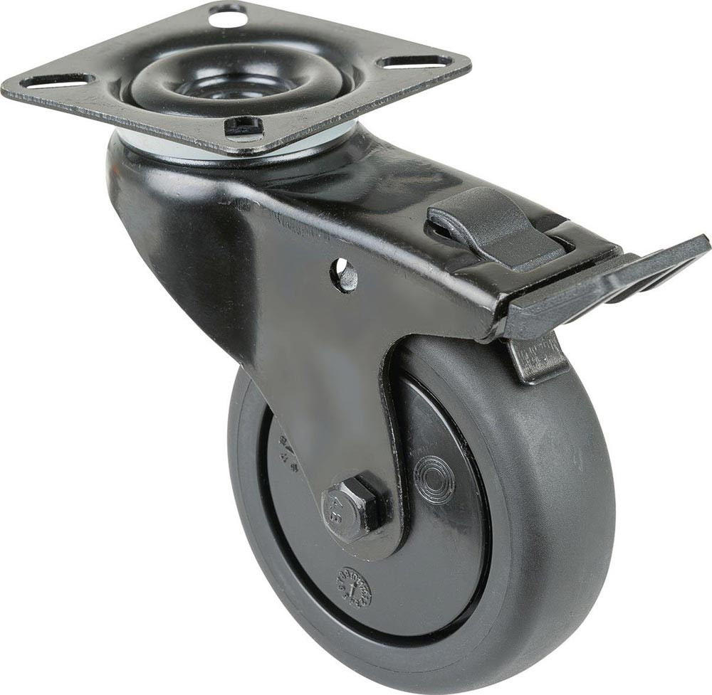 Apparaterolle mit Totalfeststeller · Gehäuse aus Stahlblech, schwarz · zweireihiger Kugelkranz im Gabelkopf · Kugellager · thermoplastisches Gummirad schwarz · Radkörper Kunststoff schwarz · sehr hoher Rollwiderstand · sehr hohe Verschleißbeständigkeit · mit Plattenbefestigung
