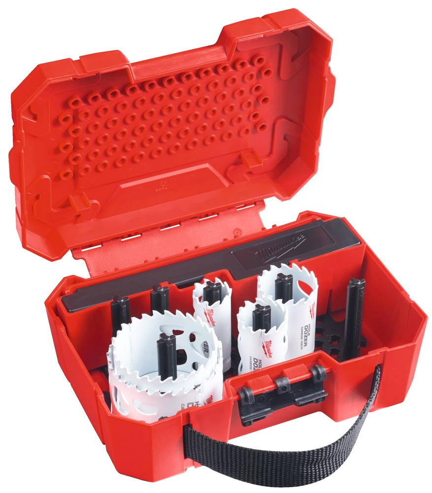 Lieferumfang: HM-Lochsägen-Durchmesser 22, 29, 35, 51, 64 mm, 2 Adapter für 14-30 mm und 32-152 mm, 2 HSS-CO Zentrierbohrer, 1/8" Sechskantschlüssel