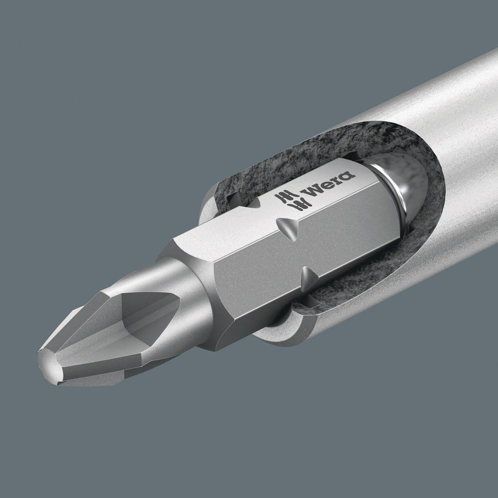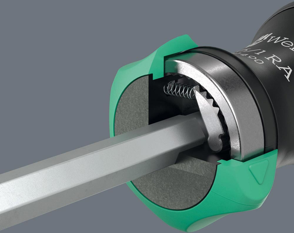 Kraftform Handhalter für 1/4″ Bits. Die im Griff integrierte Ratsche mit Feinverzahnung sorgt für schnelles Arbeiten. Das Umschalten der Schraubrichtung ist intuitiv: Wird der Ringschalter nach rechts gedreht · wird nach rechts geschraubt · wird der Ringschalter nach links gedreht · wird nach links geschraubt · für präzise Arbeiten kann die Ratschenmechanik mit der 0-Position deaktiviert werden · inklusive 6 zähharte Bits für den universellen Einsatz · untergebracht im Griff Integrierten Bit-Magazin · der starke Dauermagnet in der 1/4″ Bitaufnahme sorgt für sicheren Sitz des Bits · der 2-komponentige Kraftform Griff mit seiner Kombination aus Hart- und Weichzonen ermöglicht festes Zupacken und präzises Arbeiten
