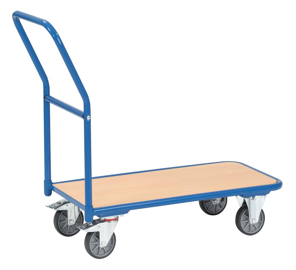 · Schweißkonstruktion aus Stahlrohr · Pulverbeschichtet · Schlag- und kratzfest · Ladefläche Holzwerkstoffplatte mit Buchendekor, bzw. mittelgrau bei RAL 7016 · 2 Lenk- und 2 Bockrollen · Lenkrollen gemäß mit Rad-Feststeller · TPE-Bereifung (thermoplastisches Elastomer) · Naben mit Rillenkugellager