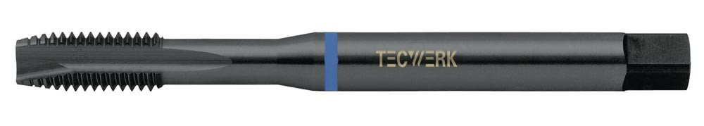 HSS-Co · Form B · Typ VA · nitriert und vaporisiert · Blauring · geradegenutet · Flanken hinterschliffen · metrisches ISO-Gewinde · DIN 13 Blatt 1 · Toleranzfeld ISO2 (6H) · mit Schälanschnitt für Durchgangsgewinde · für rost-, säure- und hitzebeständige Stähle >850 N/mm² Festigkeit