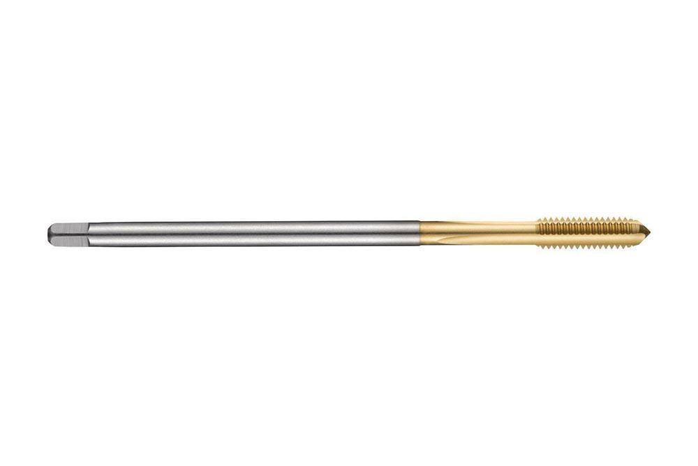 Gerade genuteter Gewindebohrer mit langem Schaft NO3 mit 2-3xP Gewindeanschnitt · ISO-Metrisches Gewinde M4 mit 0.70 mm Steigung und 6H Toleranzklasse · Abmessungen nach ISO 2283 Standard mit 3.15mm Schaft und 2.5mm Vierkantantrieb · HSSE-PM mit TiN Beschichtung 1.5xD Durchgangs- und Sacklochgewinde in Baustahl und Kohlenstoffstahl und Grauguss · Temperguss · duktiles und verdichteter Graphitguss