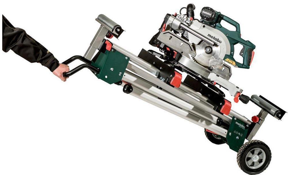 leichtes und robustes Kappsägen-Untergestell mit Trolley-Funktion für den mobilen Einsatz auch mit montierter Säge · schnell einsatzbereit durch arretierbare Klappbeine und Justiermöglichkeit für sicheren Stand · ausziehbare Werkstückauflagen mit Rollen und klappbarem Anschlag für exakte Serienschnitte · Maschinenträger (werkzeuglos montierbar) auch geeignet für alle gängigen Kappsägen · inklusive 1 Paar Maschinenträger (629008000) · max. Gewichtsbelastung im Mittelteil: 250 kg