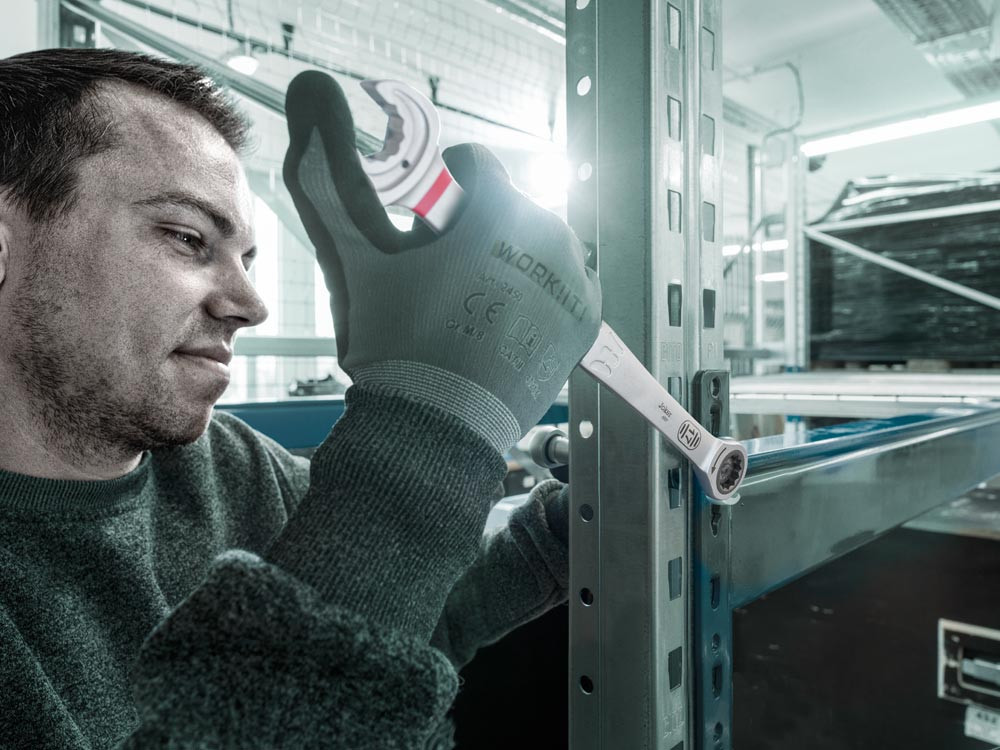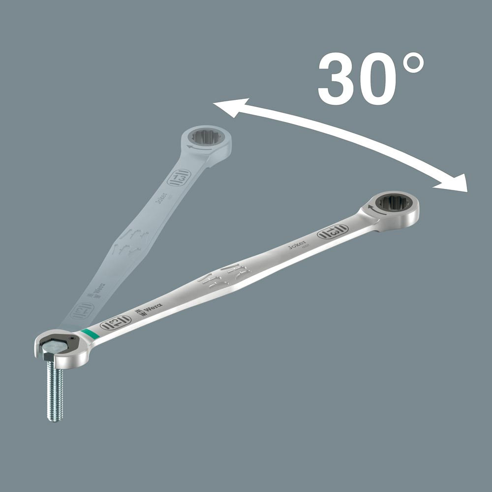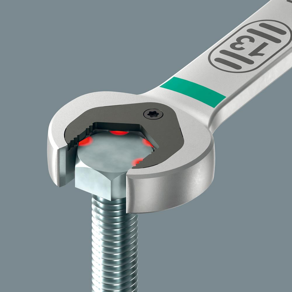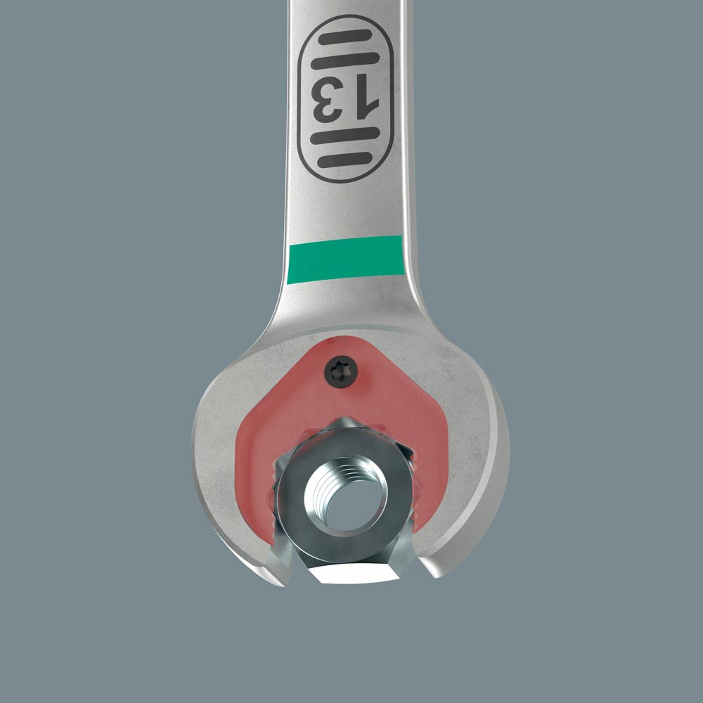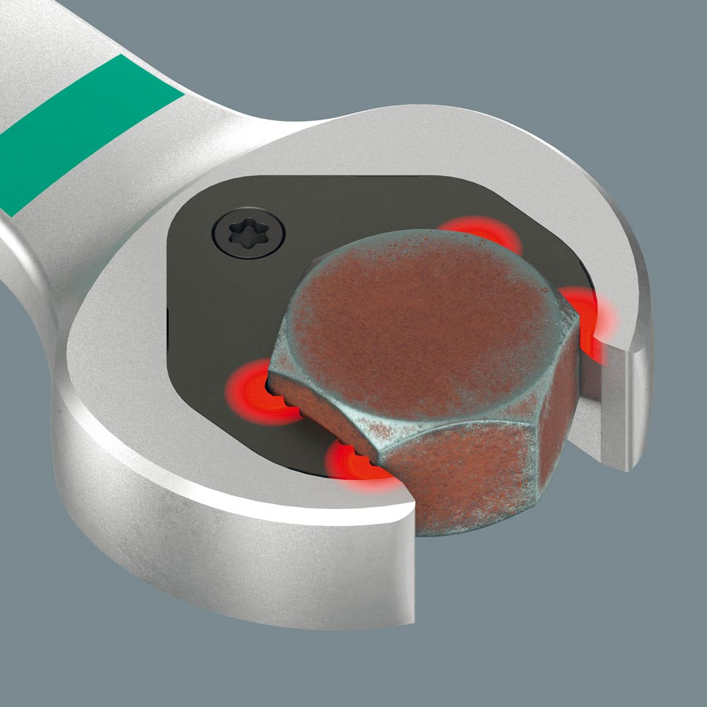 Langer Hebel ermöglicht höhere Kraftübertragung ∙ Bessere Zugänglichkeit bei tiefliegenden Verschraubungen ∙ Kein Abrutschen durch Endanschlag ∙ Mit praktischer Haltefunktion durch Metallplatte im Maul ∙ Rückschwenkwinkel im Maul von nur 30° ∙ Äußerst robuste Ringratsche ∙ Farbkennzeichnung nach Größen sowie zusätzlich aufgelaserte Größenangabe