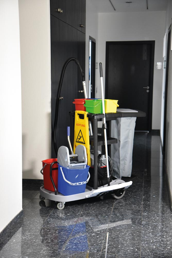 ∙ Für die Flur-, Zimmer- und Badreinigung in öffentlichen Einrichtungen, Hotels, Pensionen, Krankenhäusern und der Altenpflege geeignet ∙ Farblich getrennte Wischeimer ∙ Halterung für Wäsche- und Müllsack ∙ Der Wagen besteht aus zwei robusten Kunststoff-Bodenplatten, wobei die hintere Ablage je nach Bedarf abgenommen werden kann ∙ Fahrwerk mit stabilen Metall-Lenkrollen vorne und große, gummierte Hinterräder für den täglichen, harten Einsatz ∙ Der Deckel über dem Wäsche- und Müllsack kann bequem vom ergonomisch geformten Schubbügel aus bedient werden ∙ Ein Mopp oder Besen kann sicher im integrierten Halter fixiert werden ∙ Für das Warnschild ist eine gesonderte Halterung am Rahmen integriert
