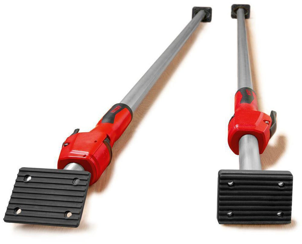 bis zu maximal bis 350 kg belastbar bei komplett eingefahrener Teleskopstange · äußerst stabile Konstruktion durch hochbelastbare Stahlrohre und rutschsichere PVC-Kontaktflächen (9 x 7 cm) · Einhandbedienung dank 2-Komponenten-Kunststoffgriff mit Pumpmechanismus · Schnellverschiebe-Taste zum schnellen Ein- und Ausfahren der Teleskopstange · regulierbare Haltekraft durch Drehen der Stütze am Griff · Einsatz auch in Schrägen durch stufenlos schwenkbare Kontaktflächen von -45° bis +45°