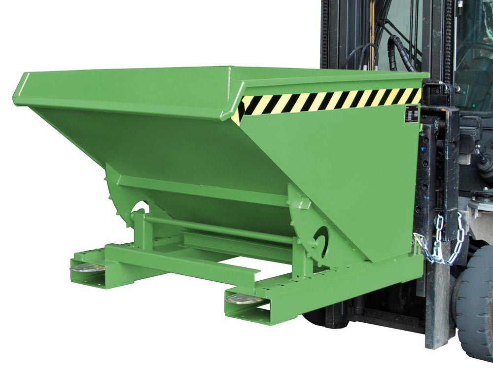 ∙ Mit Abrollsystem ∙ Mit kippbarer Mulde, 3 mm Wannenblech mit umlaufendem Randprofil ∙ Günstiger Lastschwerpunkt, Kippen in jeder Höhe per Seilzug ∙ Sicherung gegen unbeabsichtigtes Abrutschen und Auskippen ∙ Robuste Stahlblechkonstruktion ∙ Stabiler Grundrahmen mit Einfahrtaschen
