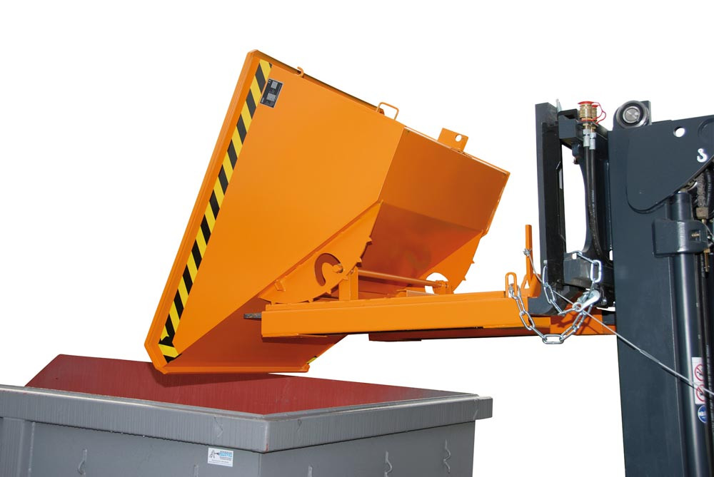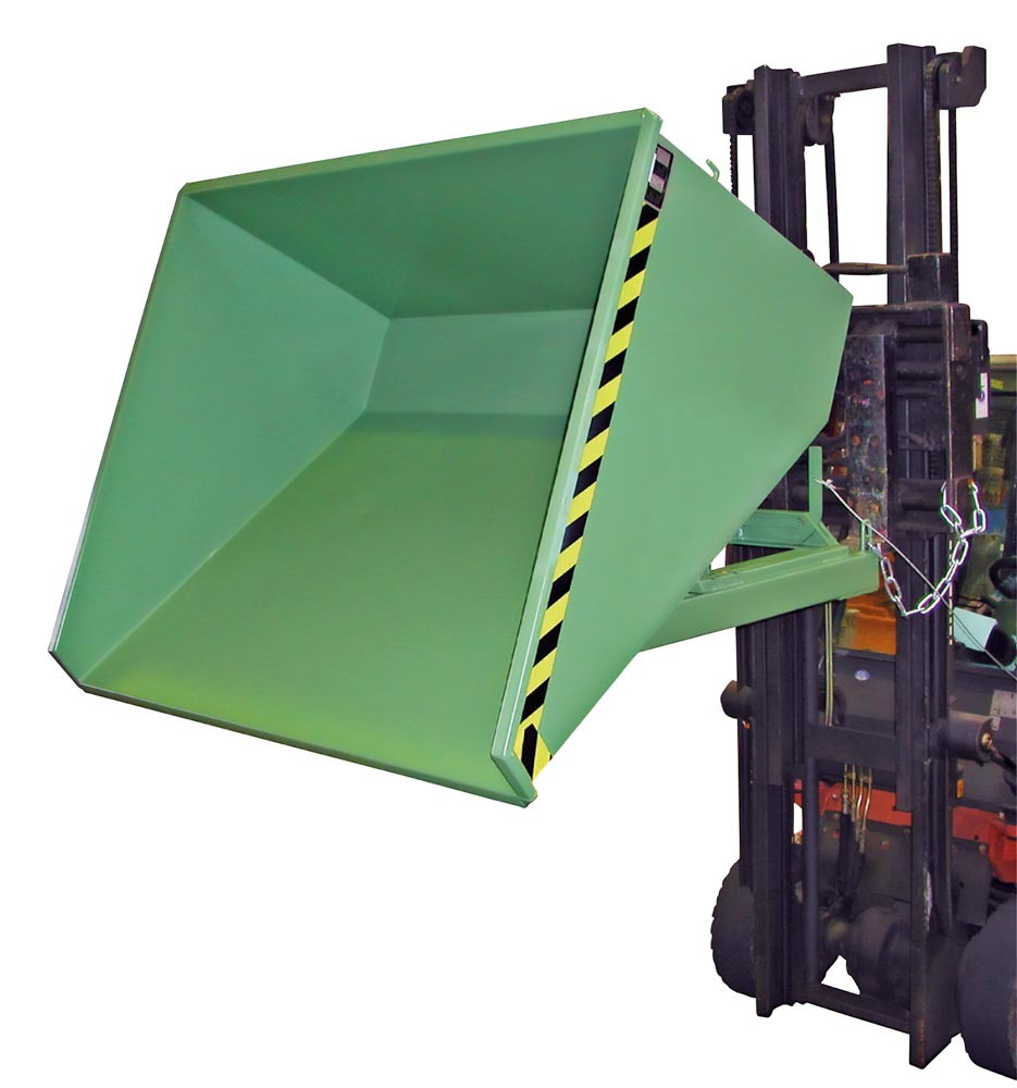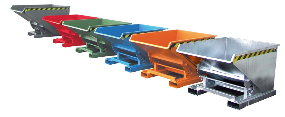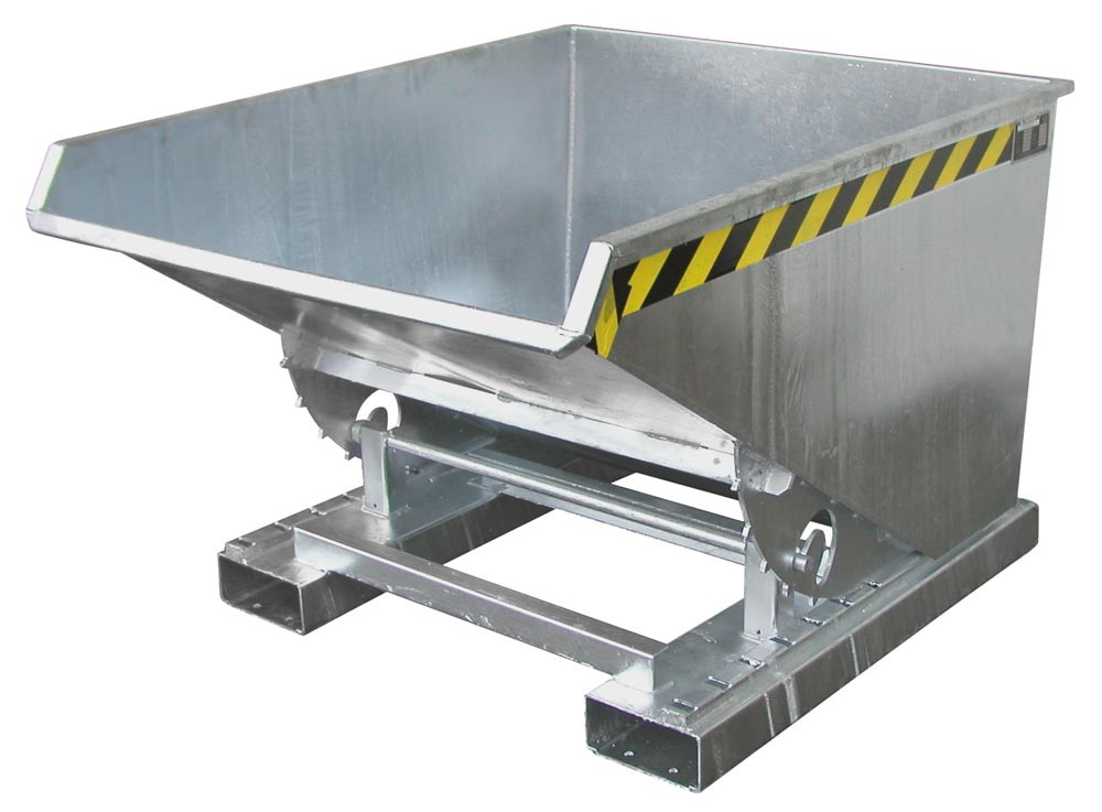 ∙ Mit Abrollsystem ∙ Mit kippbarer Mulde, 3 mm Wannenblech mit umlaufendem Randprofil ∙ Günstiger Lastschwerpunkt, Kippen in jeder Höhe per Seilzug ∙ Sicherung gegen unbeabsichtigtes Abrutschen und Auskippen ∙ Robuste Stahlblechkonstruktion ∙ Stabiler Grundrahmen mit Einfahrtaschen