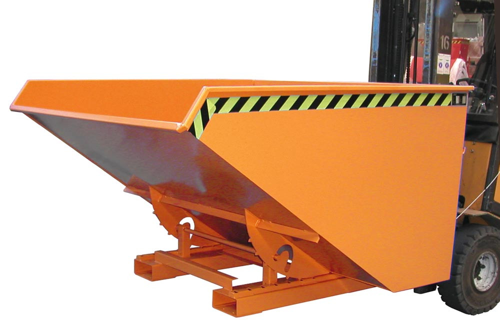 ∙ Mit Abrollsystem ∙ Mit kippbarer Mulde, 3 mm Wannenblech mit umlaufendem Randprofil ∙ Günstiger Lastschwerpunkt, Kippen in jeder Höhe per Seilzug ∙ Sicherung gegen unbeabsichtigtes Abrutschen und Auskippen ∙ Robuste Stahlblechkonstruktion ∙ Stabiler Grundrahmen mit Einfahrtaschen