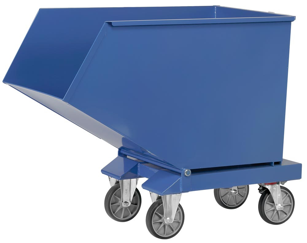 ∙ Pulverbeschichtet in RAL 5007 brillantblau, weitere Farben auf Anfrage ∙ Kippbar gelagerte Mulde aus 2 mm starkem Stahlblech, Schüttkante und Rahmen doppelt umgekantet ∙ Mulde öldicht verschweißt ∙ Untergestell aus 3 mm starkem Kantprofil mit integrierten Staplertaschen · Inkl. Trittblech, Kippsicherung und Rohrschiebegriff · Mit 2 Lenk- und 2 Bockrollen, Lenkrollen serienmäßig mit TOTALSTOP-Zentralbremssystem ausgestattet