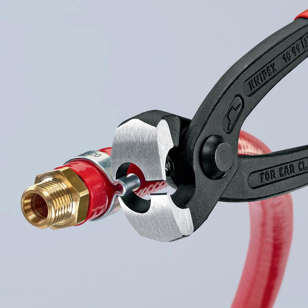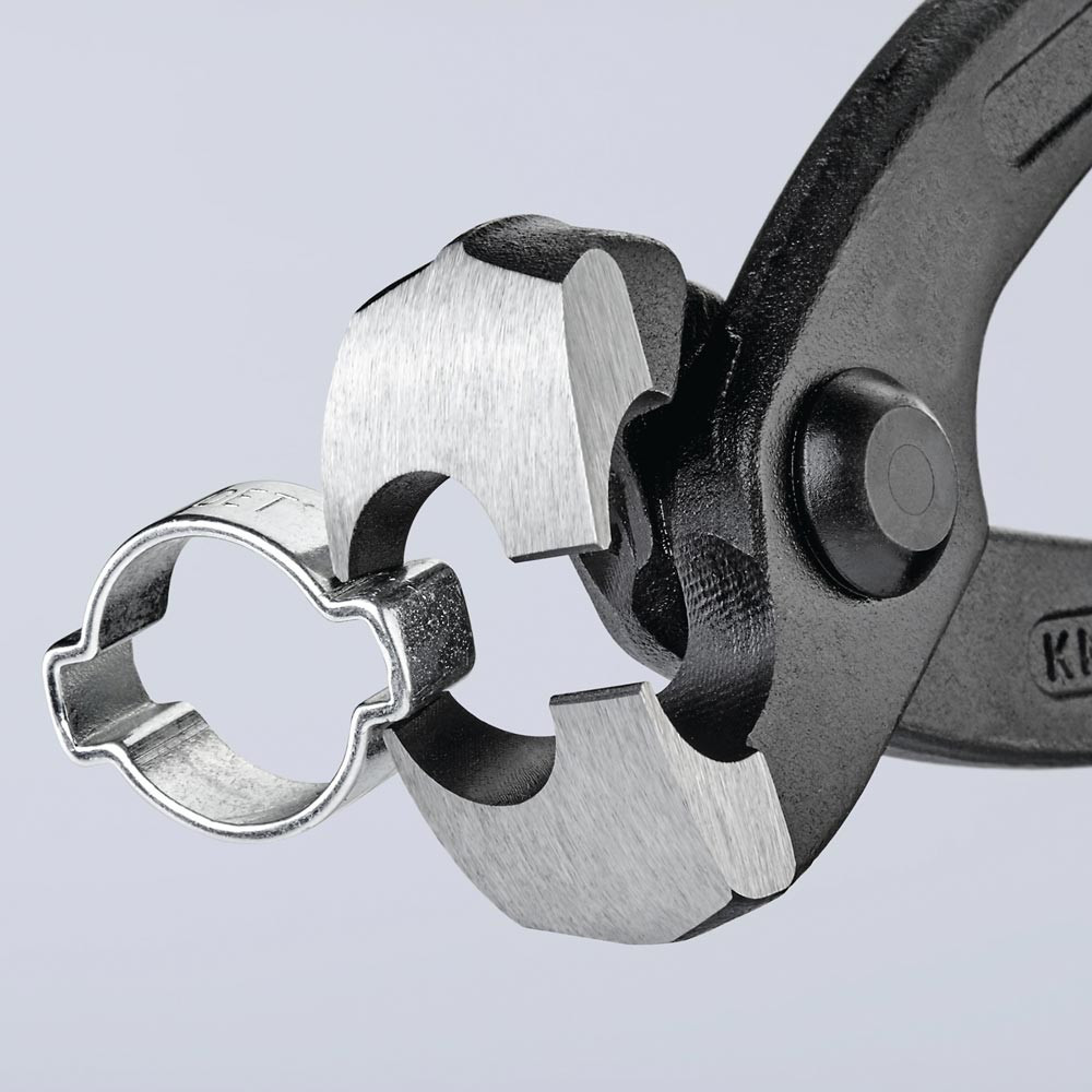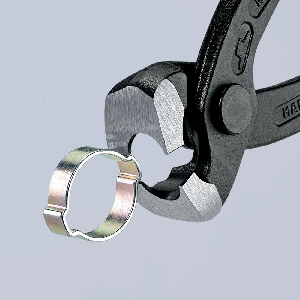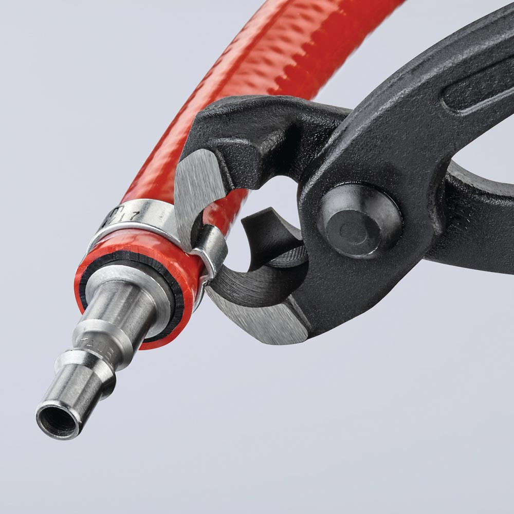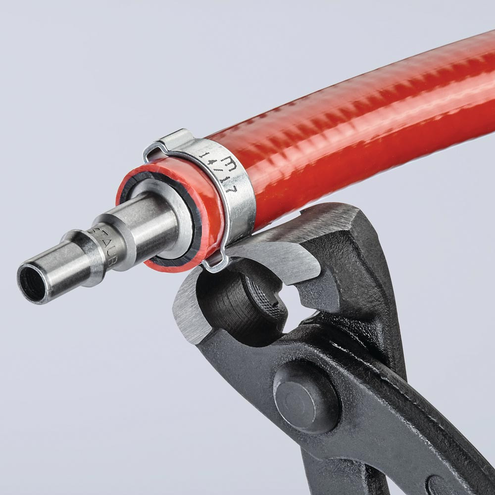 zum einfachen und zuverlässigen Befestigen von 1-Ohr- und 2-Ohrklemmen (System Oetiker oder ähnlich) · vielfältig einsetzbar für Klemmen an Achsmanschetten, Kühler- und Kraftstoffleitungen, Luftdrucksystemen, Kompressoren · Spezial-Werkzeugstahl in Sondergüte, geschmiedet, ölgehärtet · mit seitlicher Pressnase