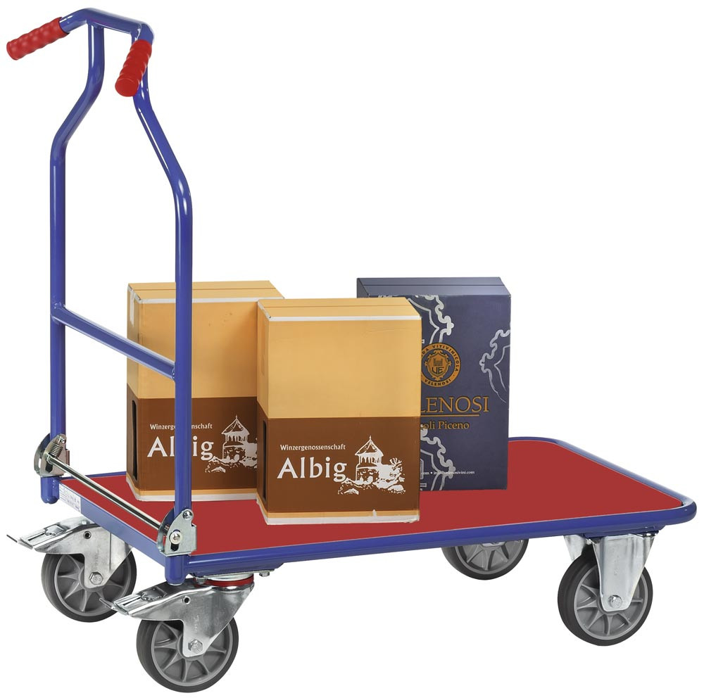 · Schweißkonstruktion aus Stahlrohr · Stahlgestell pulverbeschichtet in RAL 5007 brillantblau · Schlag- und kratzfest · Schiebebügel abklappbar · Verriegelung automatisch · Entriegelung über Fußpedal · Ladefläche Holzwerkstoffplatte mit farbiger Kunststoffoberfläche in rot · 2 Lenk- und 2 Bockrollen · Lenkrollen gemäß EN 1757-3 mit Rad-Feststeller · TPE-Bereifung · Naben mit Rillenkugellager