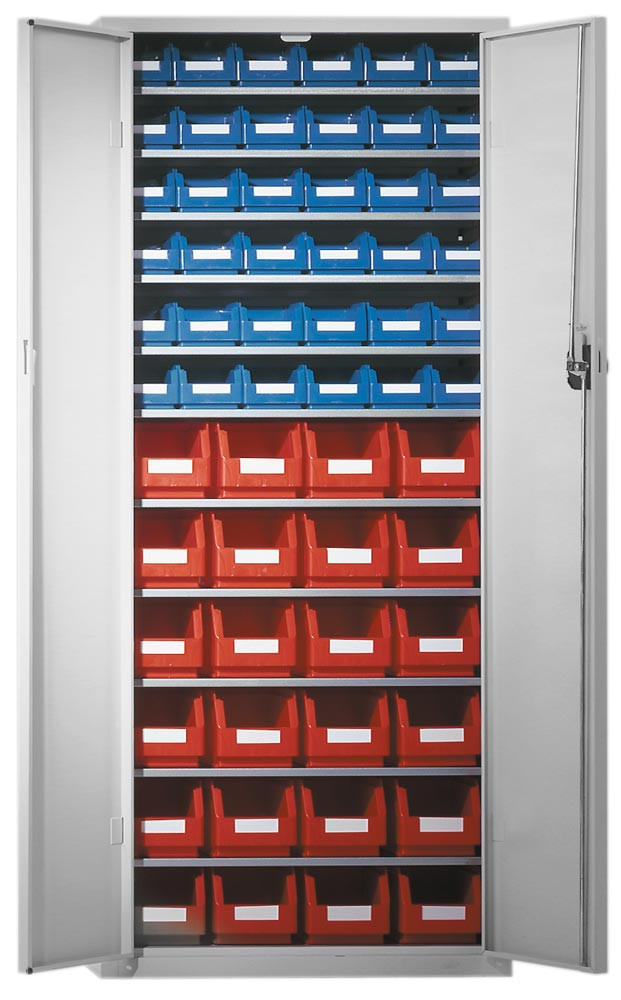 · Solide, innen und aussen schlag- und kratzfeste Stahlkonstruktion mit Kunststoffbeschichtung in RAL 7035 lichtgrau · Fachböden aus verzinktem Stahlblech, im Raster von 15 mm verstellbar · Tür-Öffnungswinkel über 180° · Dreiriegeliges Sicherheits-Zylinderschloss mit versenkbarem Drehgriff · Die Bestückung mit Sichtlagerkästen erfolgt je Größe und farblich sortiert