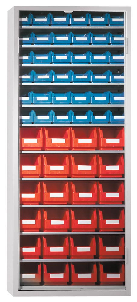 · Solide, innen und aussen schlag- und kratzfeste Stahlkonstruktion mit Kunststoffbeschichtung in RAL 7035 lichtgrau · Fachböden aus verzinktem Stahlblech, im Raster von 15 mm verstellbar · Tür-Öffnungswinkel über 180° · Dreiriegeliges Sicherheits-Zylinderschloss mit versenkbarem Drehgriff · Die Bestückung mit Sichtlagerkästen erfolgt je Größe und farblich sortiert