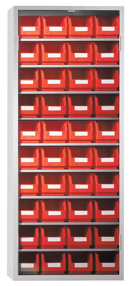 · Solide, innen und aussen schlag- und kratzfeste Stahlkonstruktion mit Kunststoffbeschichtung in RAL 7035 lichtgrau · Fachböden aus verzinktem Stahlblech, im Raster von 15 mm verstellbar · Tür-Öffnungswinkel über 180° · Dreiriegeliges Sicherheits-Zylinderschloss mit versenkbarem Drehgriff · Die Bestückung mit Sichtlagerkästen erfolgt je Größe und farblich sortiert