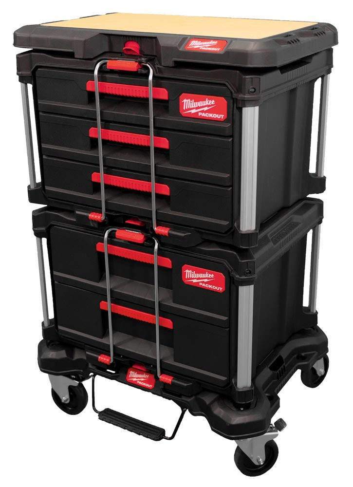 PACKOUT Starter-Set Automotive Rollbrett, Koffer mit 2 Schubladen, Koffer mit 3 Schubladen u. Holz-Arbeitsplatte