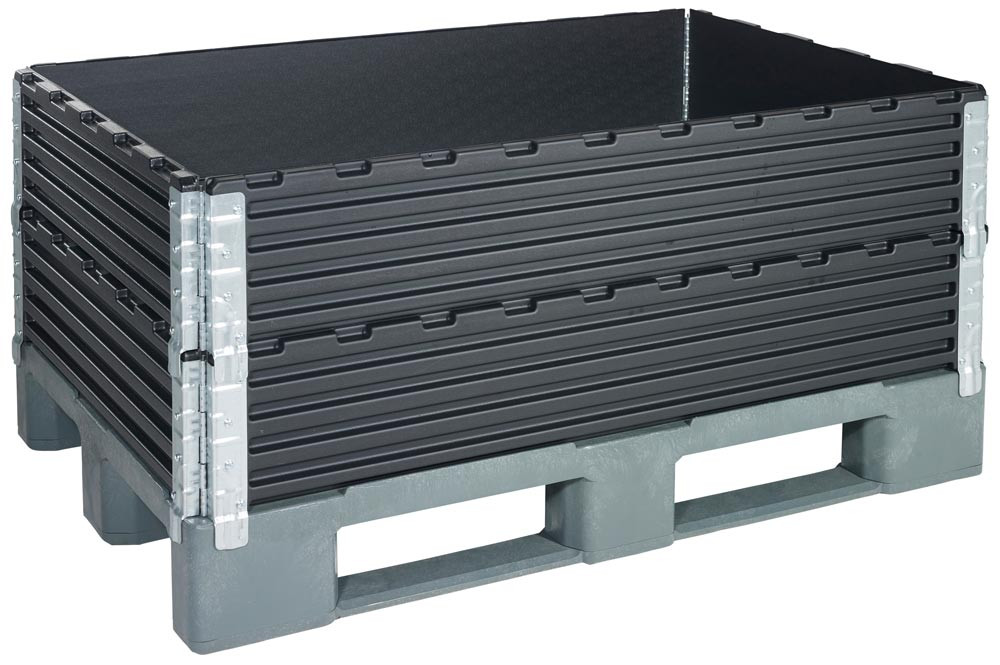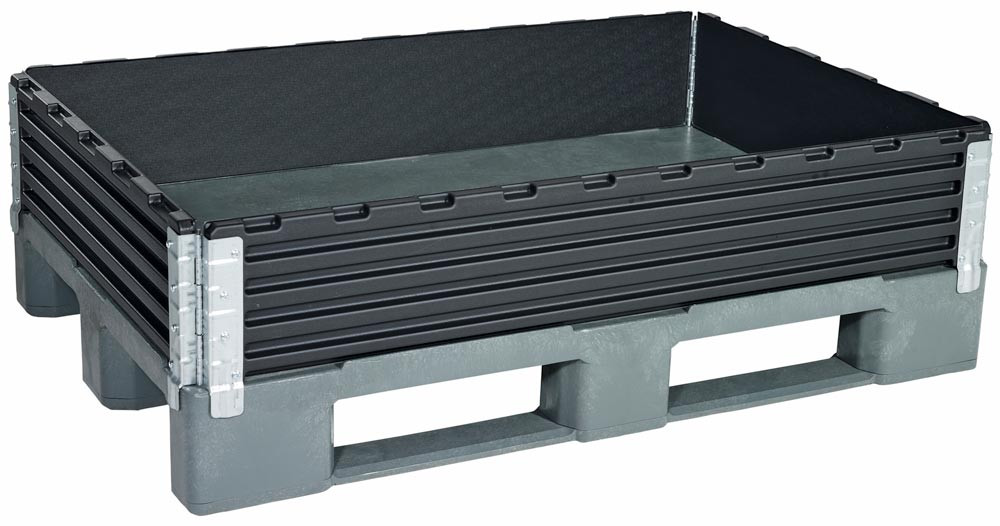 ∙ Aufsatzrahmen für Euro- und Industriepaletten ∙ Aus ABS mit verzinkten Scharnieren ∙ Diagonal klappbar ∙ Rahmenstärke 20 mm ∙ Bei Nichtgebrauch platzsparend zusammenfaltbar ∙ Farbe schwarz ∙ VE 2 Stück